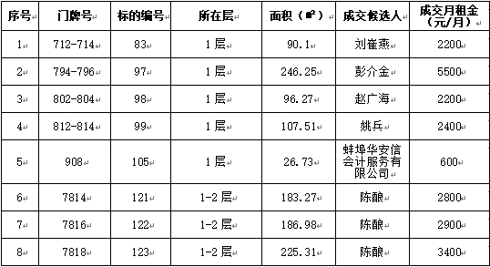 喜迎門小區(qū)部分商鋪公開(kāi)競(jìng)價(jià)招租工作已經(jīng)結(jié)束,成交候選人已經(jīng)確定?,F(xiàn)將競(jìng)租結(jié)果公示如下: