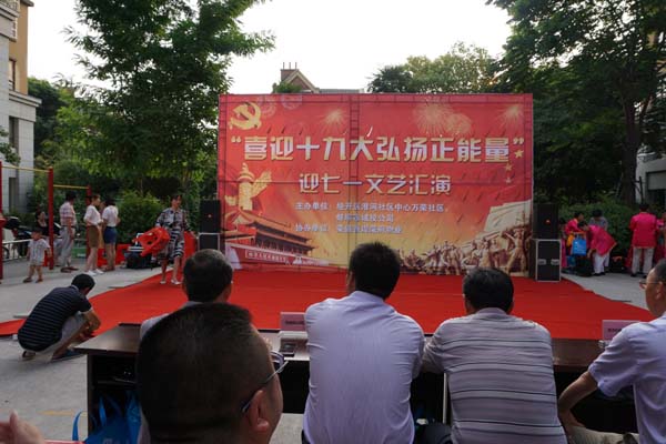 為喜迎建黨96周年和十九大勝利召開,進(jìn)一步激發(fā)黨員群眾的愛國(guó)主義情懷,增進(jìn)基層黨組織的凝聚力和戰(zhàn)斗力,6月29日,市城投公司組織全體黨員與結(jié)對(duì)共建單位經(jīng)開區(qū)萬榮社區(qū)共同開展“喜迎十九大,弘揚(yáng)正能量”迎七一文藝匯演活動(dòng),現(xiàn)場(chǎng)氣氛活躍,表演者們載歌載舞,用動(dòng)聽的歌聲和柔美的舞蹈詮釋出在黨的光輝照耀下一片國(guó)泰民安的祥和景象。