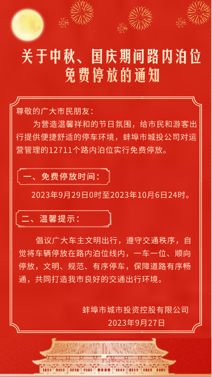 關于中秋、國慶期間路內泊位免費停放的通知 尊敬的廣大市民朋友: 為營造溫馨祥和的節(jié)日氛圍,給市民和游客出行提供便捷舒適的停車環(huán)境,中秋、國慶假期期間,蚌埠城投對運營管理的12711個路內泊位實行免費停放。 免費停放時間: 2023年9月29日0時至2023年10月6日24時。 溫馨提示: 倡議廣大車主文明出行,遵守交通秩序,自覺將車輛停放在路內泊位線內,一車一位、順向停放,文明、規(guī)范、有序停車,保障道路有序暢通,共同打造我市良好的交通出行環(huán)境。 蚌埠市城市投資控股有限公司 2023年9月27日 打印本頁 關閉窗口