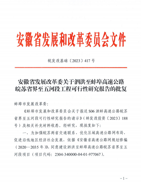 S06泗蚌高速公路皖蘇省界至五河段初步設(shè)計通過省交通運輸廳審查